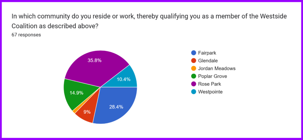 In addition to voting, attendees also shared where they live or work, highlighting the broad geographic representation that makes up the Coalition. Participants came from across the west side, with the largest shares from Rose Park (35.8%) and Fairpark (28.4%), followed by Poplar Grove (14.9%), Westpointe (10.4%), Glendale (9%), and a small number from Jordan Meadows.