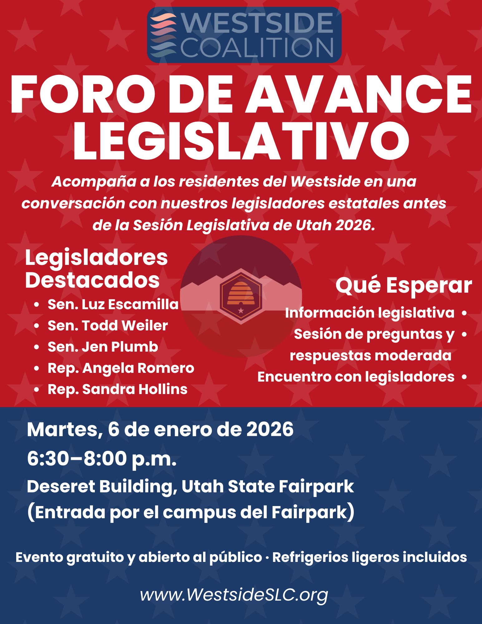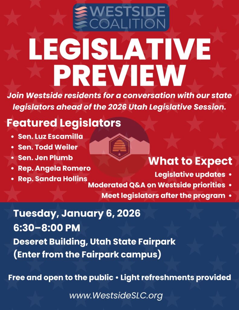 Join Westside residents for a conversation with our state legislators ahead of the 2026 Utah Legislative Session.