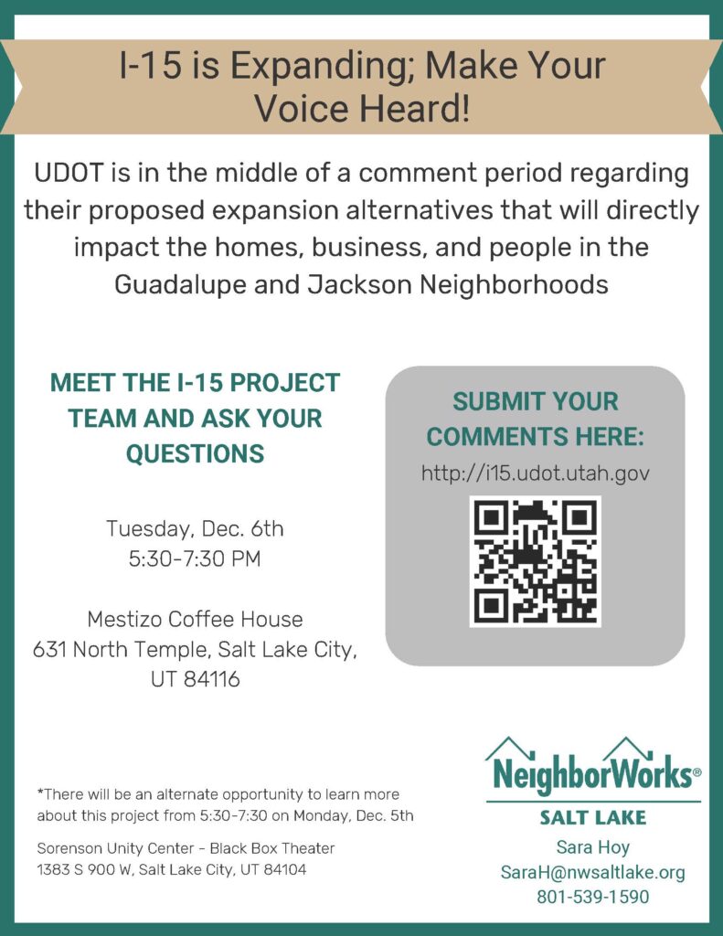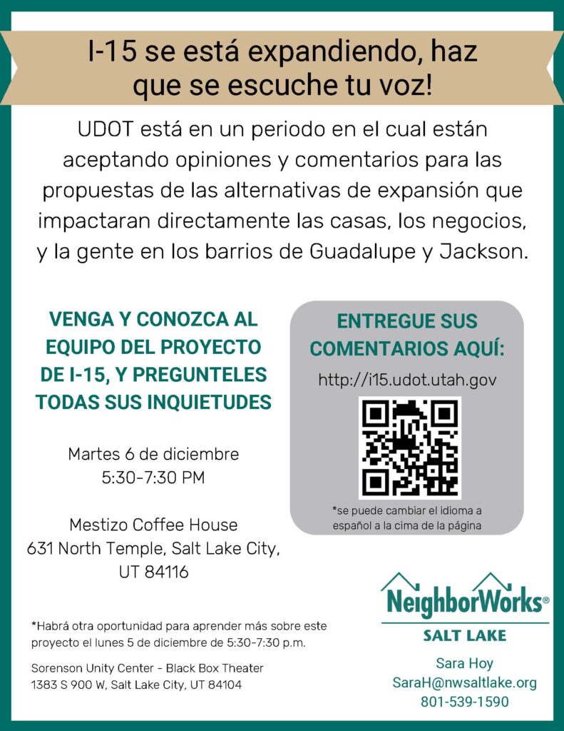 The first is an Open House hosted by NeighborWorks SLC on Monday December 5th from 5:30 – 7:30 PM at Sorensen Unity Cente. The Westside Coalition will be there to listen to your comments and help get them to the right place.